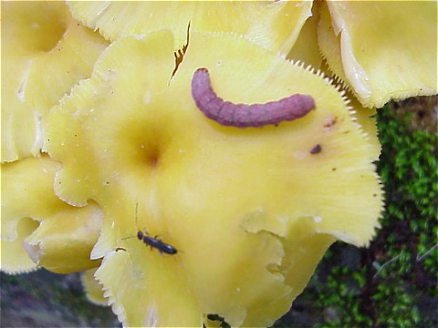 7.観察事項 ハルニレに発生したタモギタケの成菌は独特の臭いで多くの虫たちをおびき寄せている。多量の胞子を放出し、さらに動物に胞子をはこばせていた。